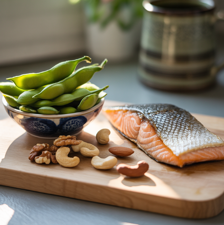 연어, 고등어, 참치와 같은 등푸른 생선에는 오메가-3 지방산이 많이 들어 있습니다. 오메가-3는 혈관 염증을 줄이고 혈중 콜레스테롤을 조절해 심혈관질환 예방에 도움이 됩니다. 갱년기 이후에는 심혈관질환 위험이 높아지기 때문에 주 2~3회 정도 꾸준히 섭취하는 것을 추천합니다.