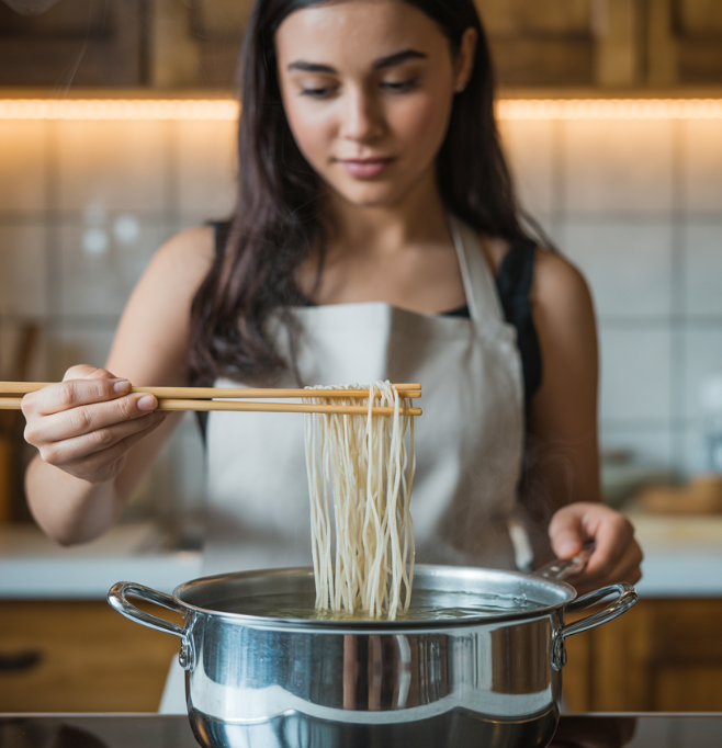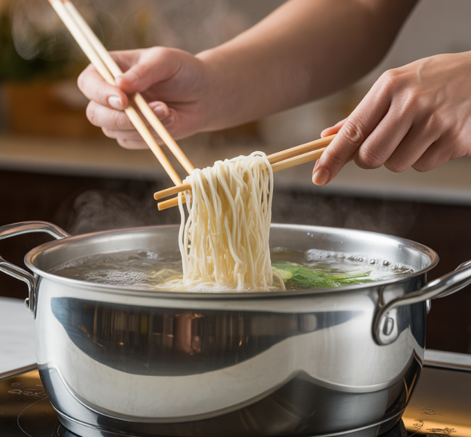 끓는 물에 소면을 넣고 젓가락으로 저어주며 3~4분 정도 삶습니다. 물이 끓어 넘치면 찬물 한 컵을 부어 온도를 조절하고, 다시 끓어오르면 또 찬물을 부어주는 “물 붓기” 과정을 2번 정도 반복하면 면이 탱탱하게 익습니다.