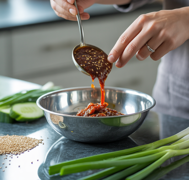비빔국수의 맛을 좌우하는 것은 단연 양념장입니다. 새콤달콤하면서도 매콤한 맛의 균형을 잡는 것이 중요하죠.