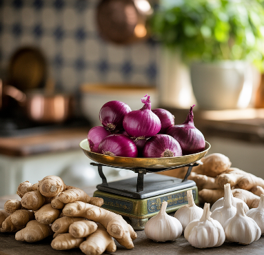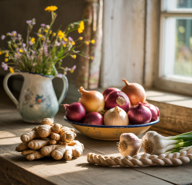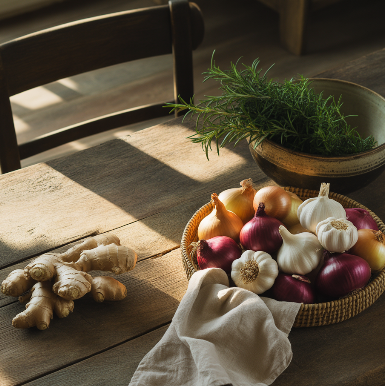 마늘에 들어 있는 알리신은 강력한 항균·항바이러스 성분으로, 면역력 강화와 함께 비염 원인균 억제에 효과적입니다.