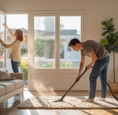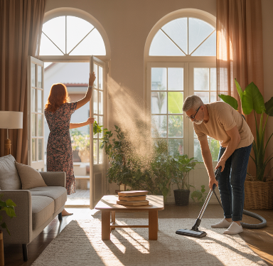 집안의 미세먼지와 먼지를 줄이기 위해 자주 환기하고 청소하기