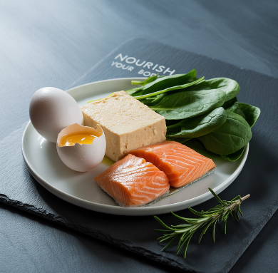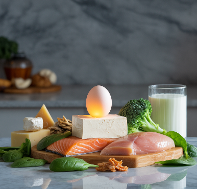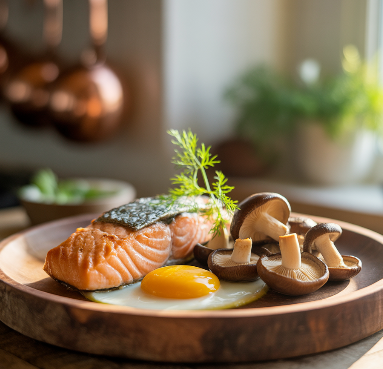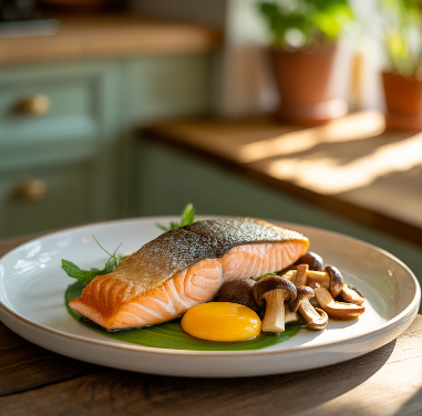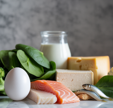 비타민 D: 칼슘 흡수 보조 → 연어, 달걀노른자, 버섯, 햇볕 노출