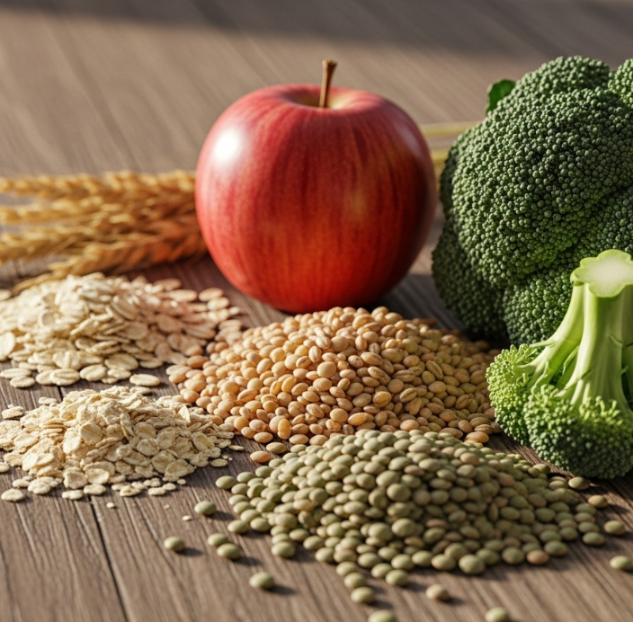 귀리, 보리, 렌틸콩, 사과, 브로콜리 등 수용성 식이섬유는 소장에서 콜레스테롤 흡수를 막아줍니다.